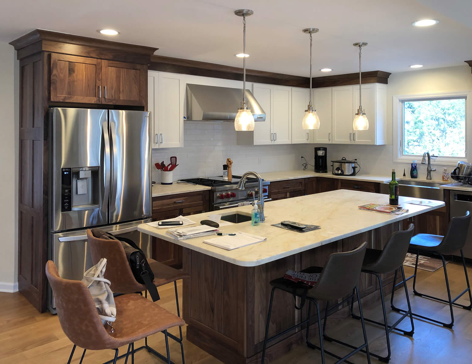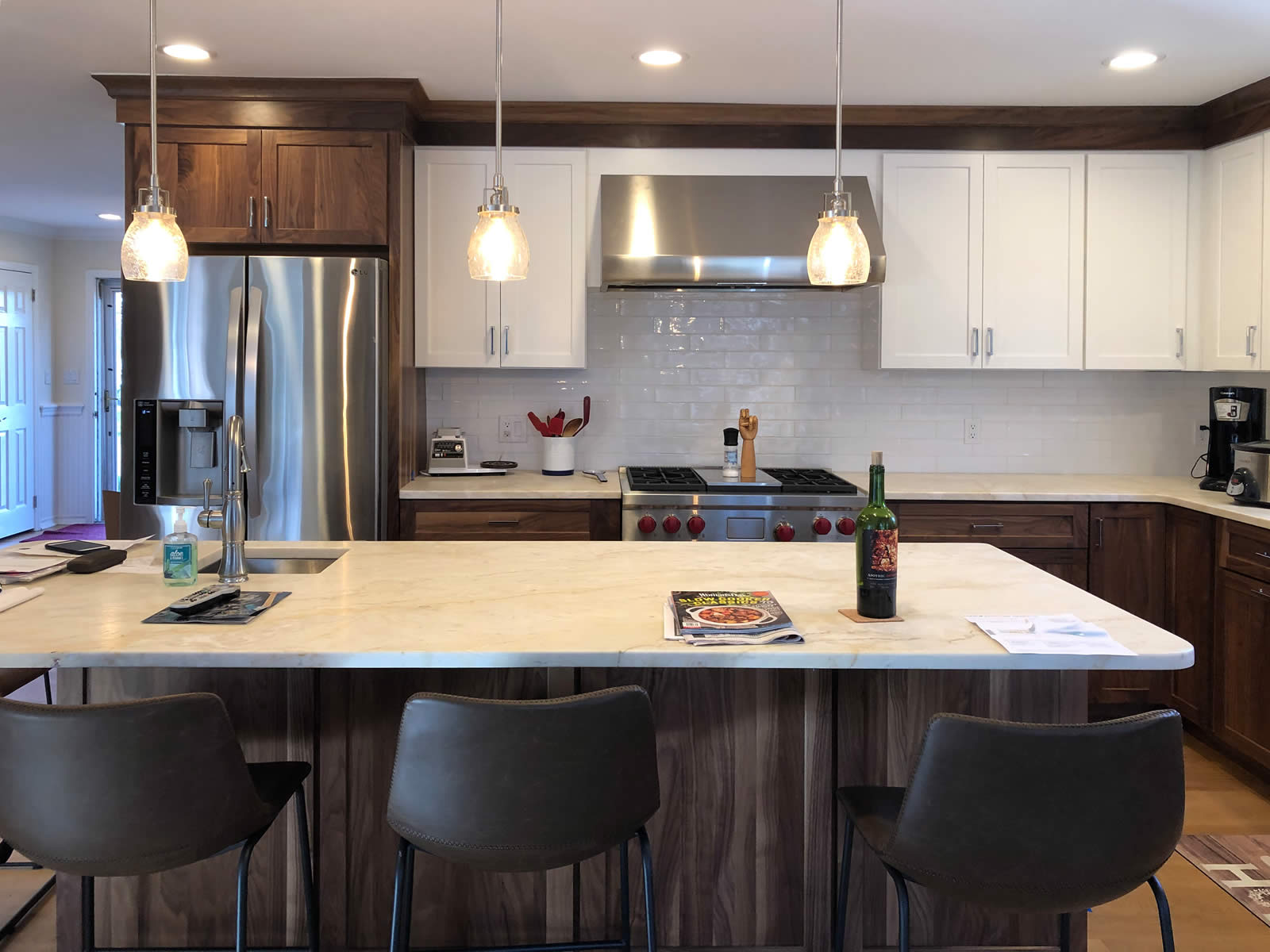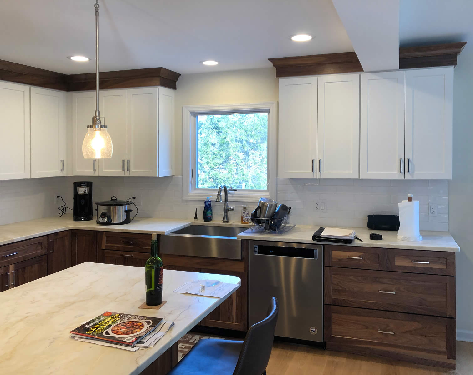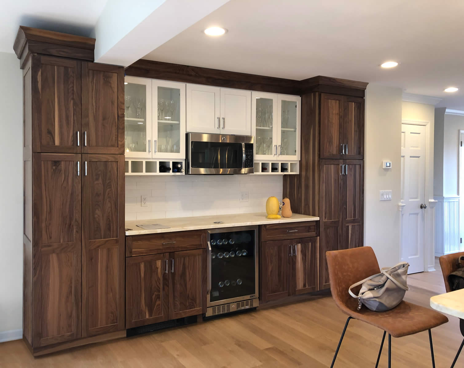 The lower and tall cabinets are Natural Walnut. The upper cabinets have a Beach House finish.